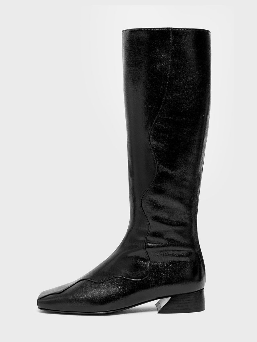 - 각진 스퀘어 토 실루엣으로 세련된 인상을 주는 롱부츠