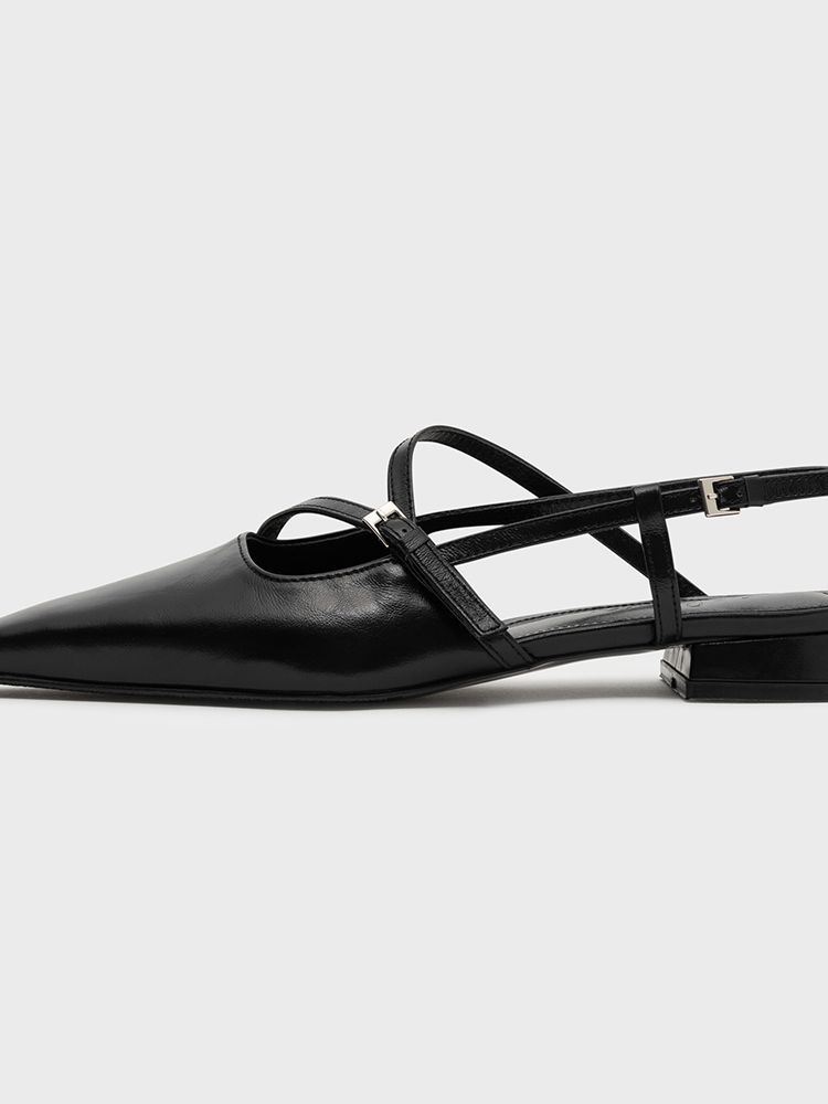 우아한 스퀘어 탑 라인 위에 스트랩을 올린 슬링백 디자인입니다.