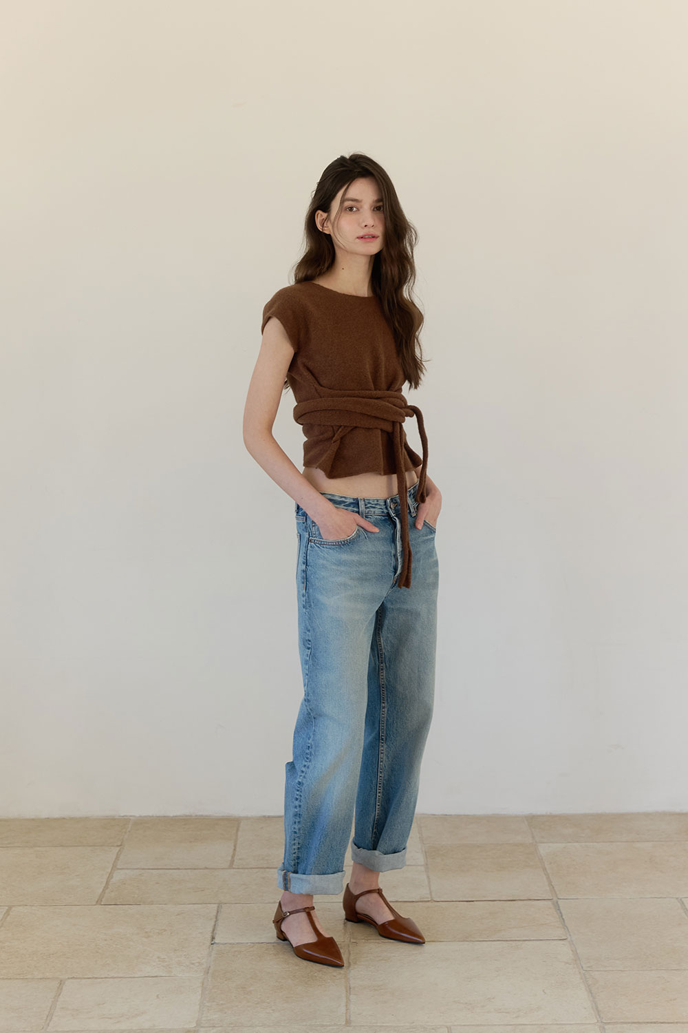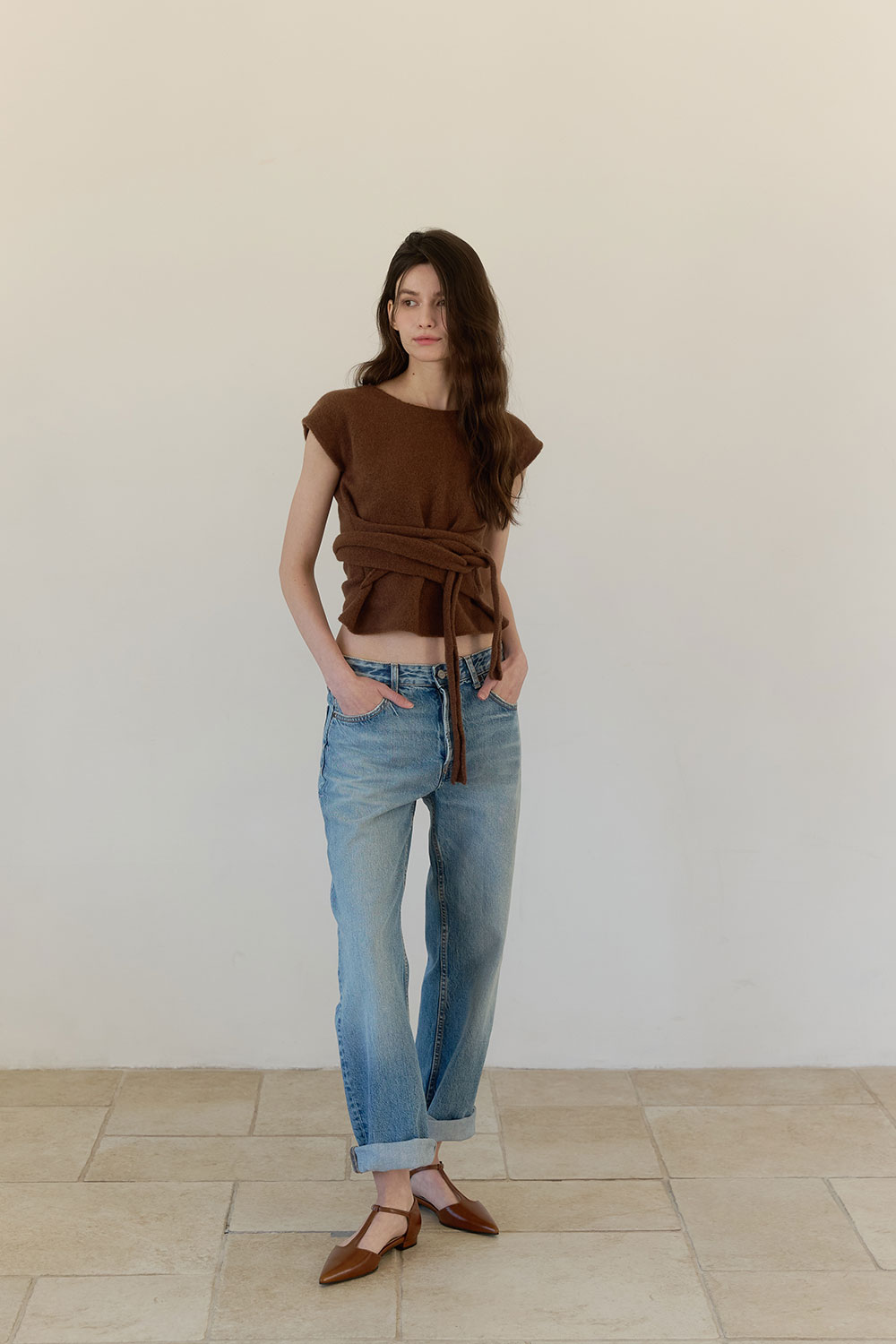 세련된 브라운 컬러와 드럼 다잉 방식으로 가공된 부드러운 이탈리아산 카우 레더가 조화를 이루어, 클래식하면서도 우아한 무드를 연출하는 T-스트랩 플랫 슈즈입니다. 발등을 안정감 있게 감싸는 스트랩 디자인과 슬림한 포인트 토 실루엣이 다리 라인을 더욱 길고 정돈되게 보이도록 돕습니다. 낮은 굽으로 편안한 착화감을 제공하며, 가볍고 유연한 소재로 장시간 착용에도 부담이 없습니다. 미니멀한 디자인 속 섬세한 디테일이 돋보이며, 데일리부터 격식 있는 자리까지 다양하게 스타일링할 수 있는 timeless한 아이템입니다.