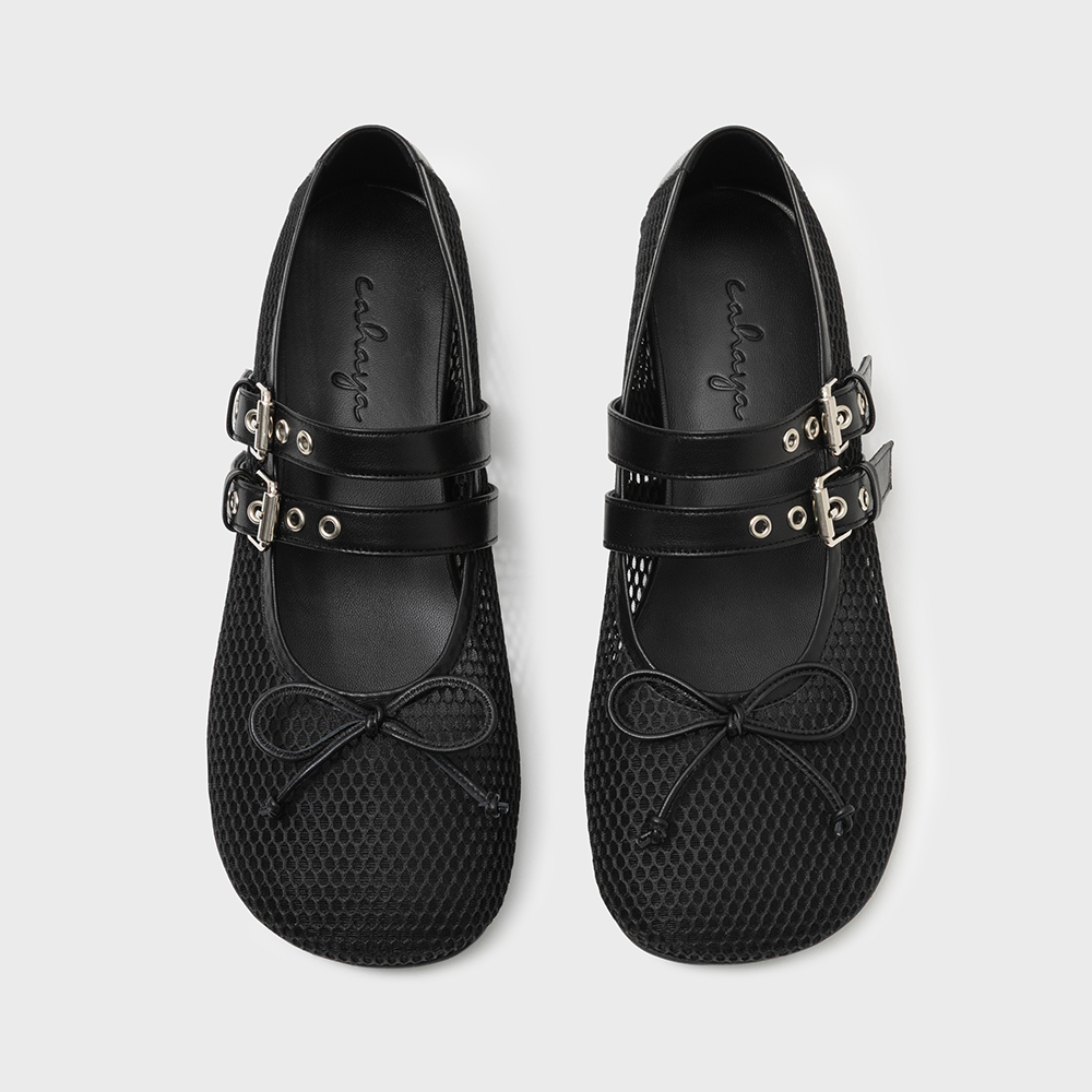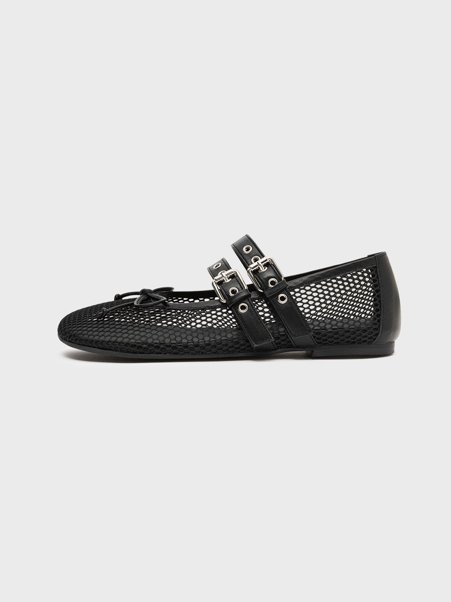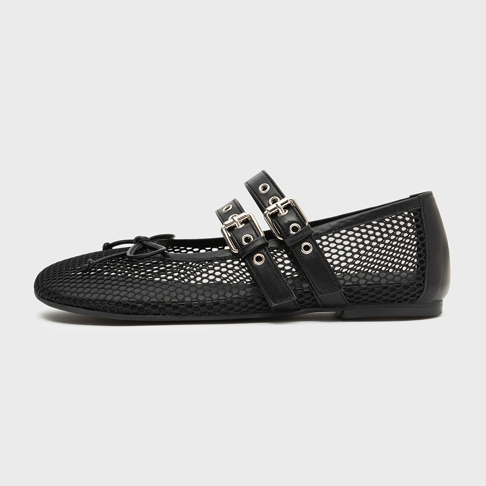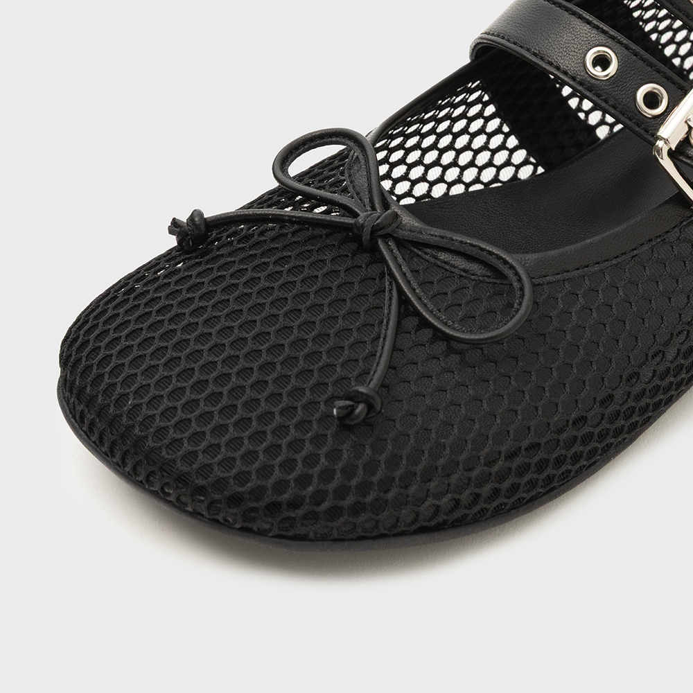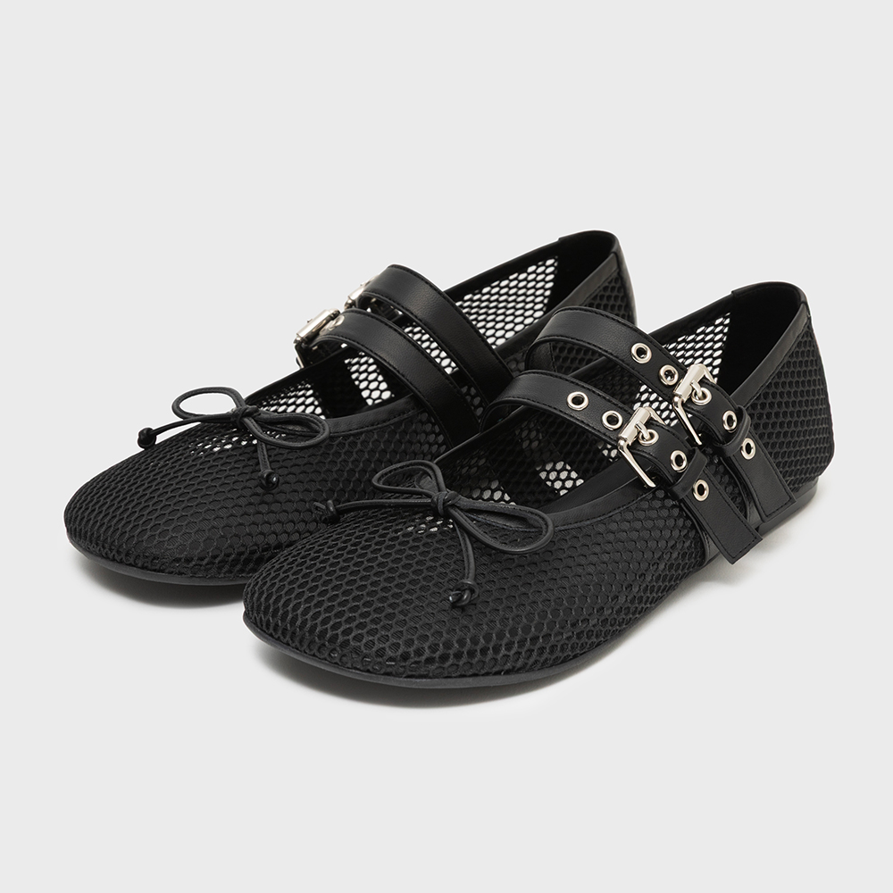 통기성 좋은 메쉬 바디에 더블 스트랩과 실버 버클 디테일을 더한 썸머 메리제인 플랫입니다.