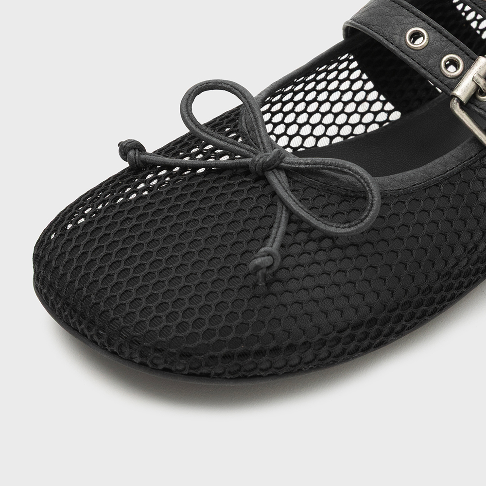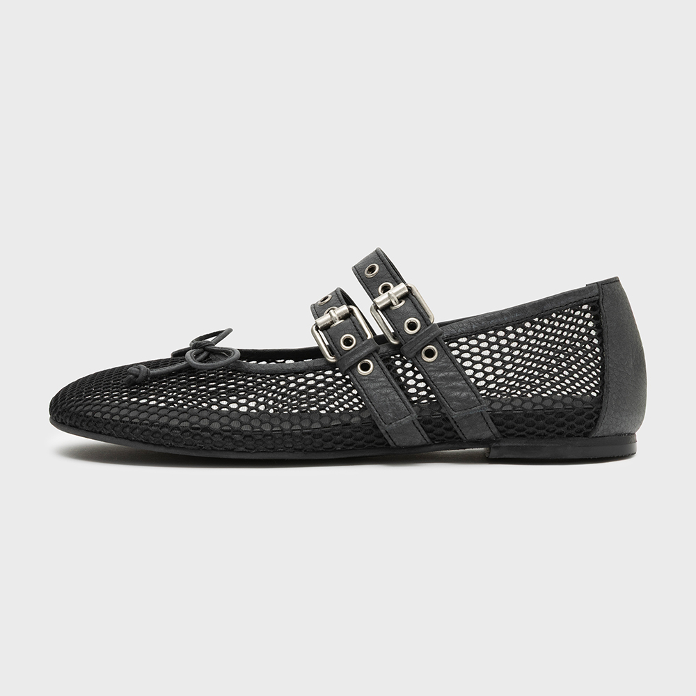 통기성 좋은 메쉬 바디에 더블 스트랩과 실버 버클 디테일을 더한 썸머 메리제인 플랫입니다.
